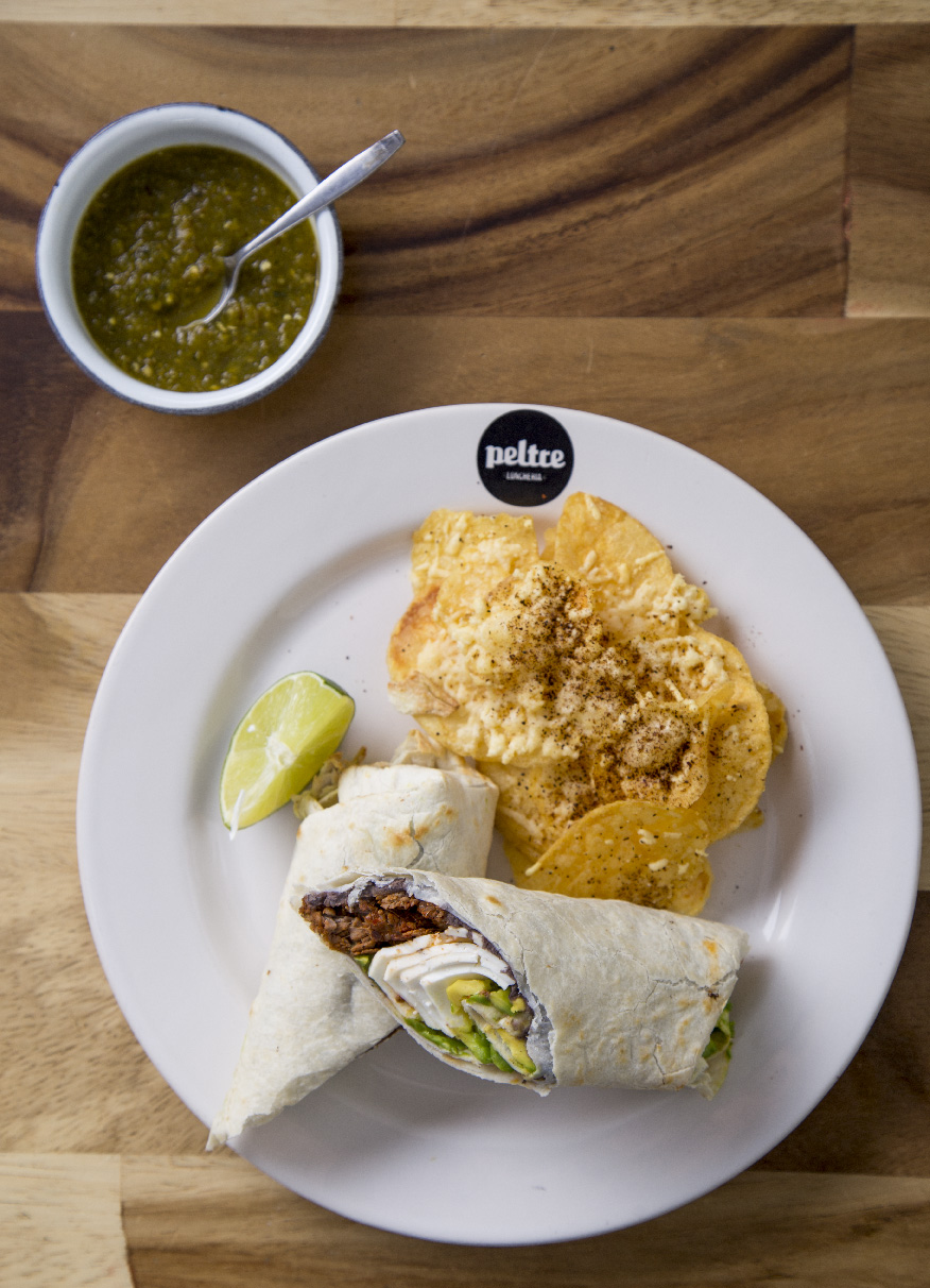 340 g. Burrito relleno de Sirloin Prime con queso fresco, aguacate y frijoles, acompañado de papas crujientes con polvo de chiles y queso parmesano. Servido con salsa de chile cuaresmeño.