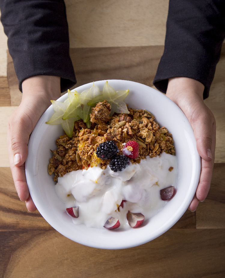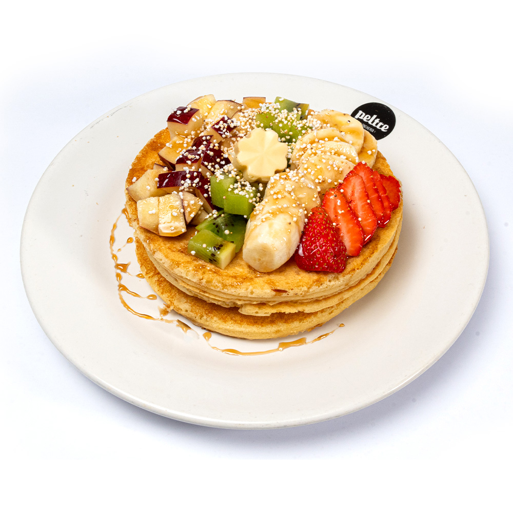 500 g. Tres piezas, elaboradas con masa tradicional mezclada con amaranto, fruta de temporada, mantequilla, espolvoreadas con amaranto y jarabe de maple o mermelada de la casa o miel de abeja.