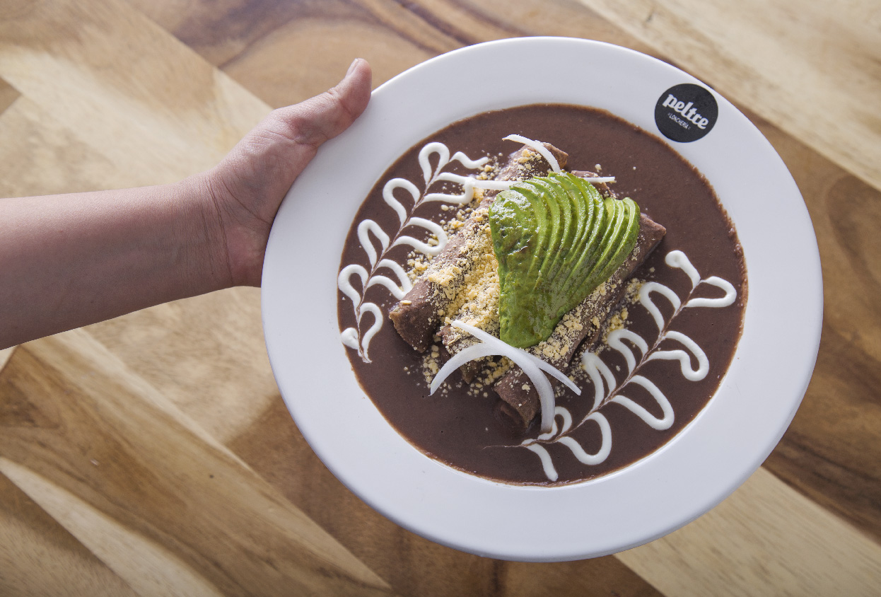 390 g. Cuatro enfrijoladas de ayocote morado con hoja de aguacate, rellenas a tu elección (pollo, queso panela o huevo), decoradas con cebolla morada, crema, aguacate y queso rallado chiapas.