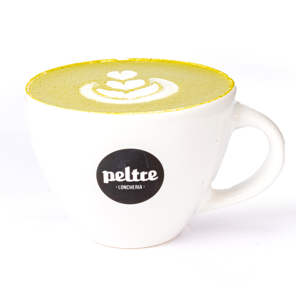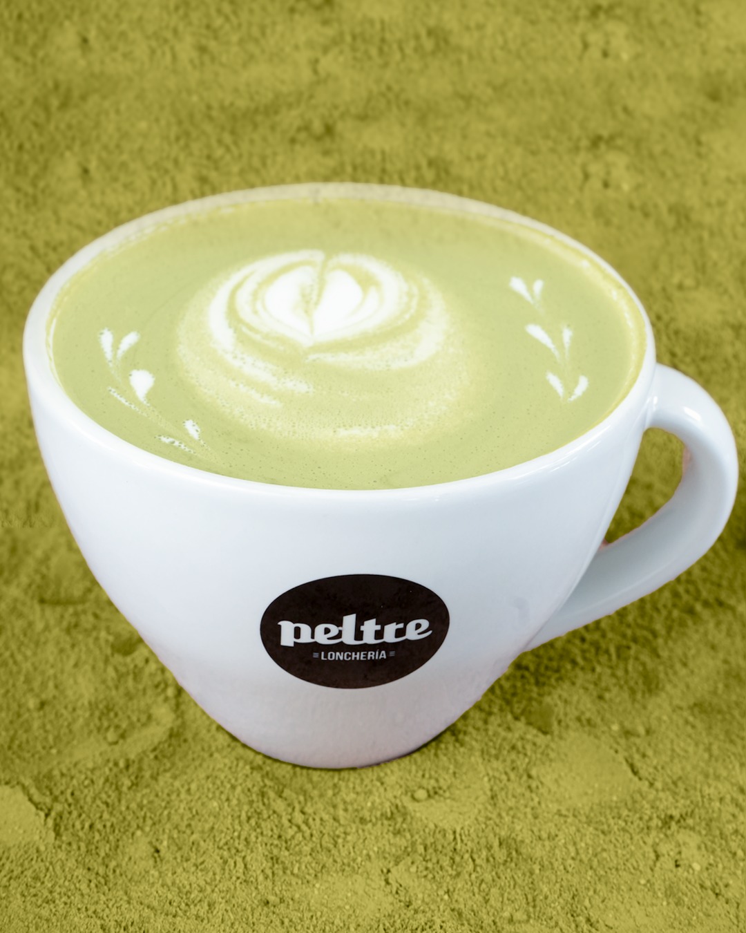 Polvo de matcha con leche cremada, muy espumosa y agua.