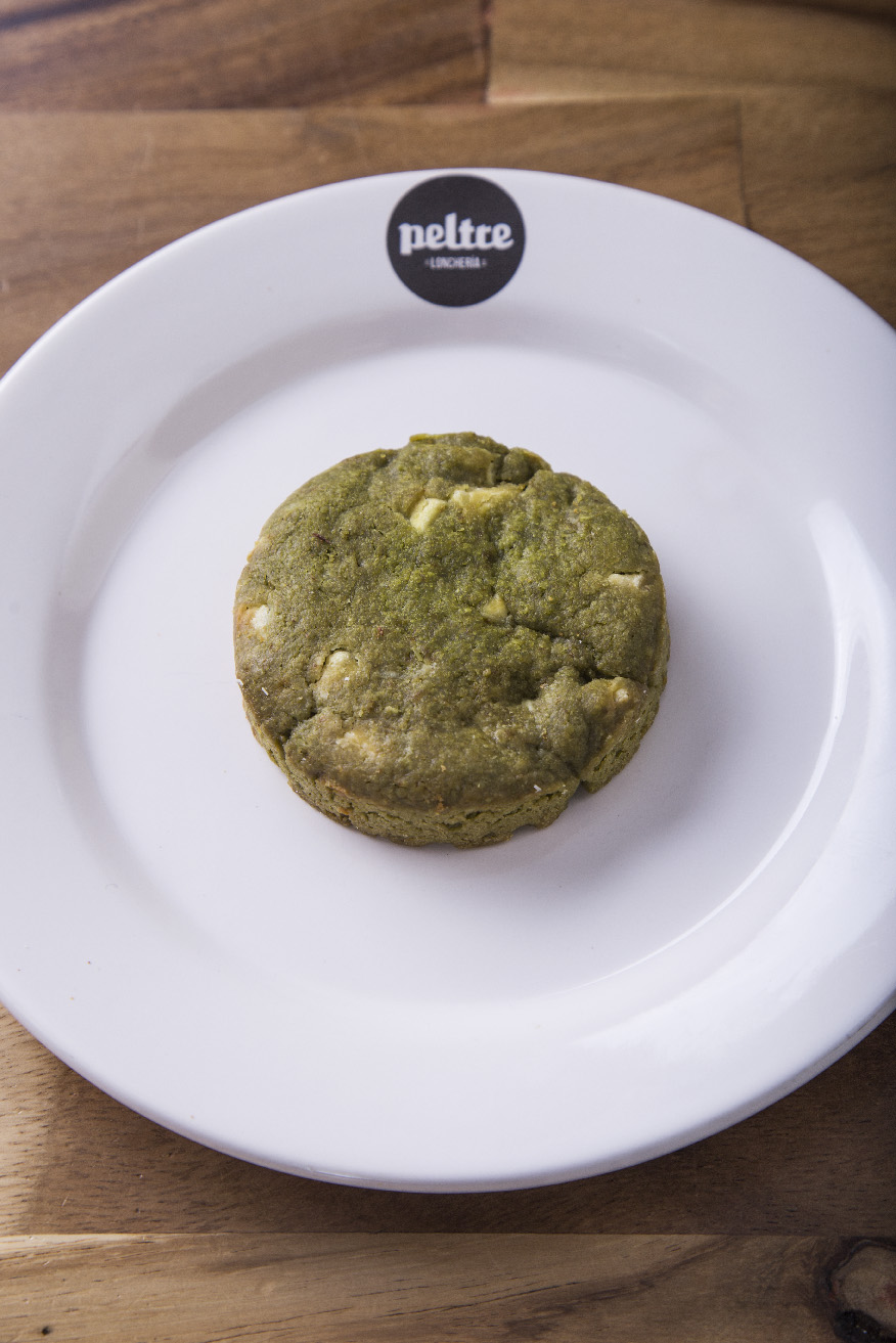 Elaborada con harina de trigo, azúcar, avena en polvo, polvo para hornear, chocolate blanco y matcha.