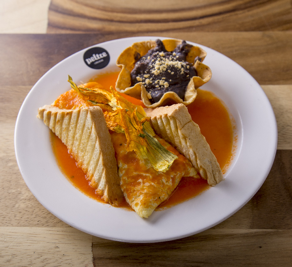 225 g. Huevos en omelette relleno de queso de cabra con espinaca, servido con caldillo de jitomate y flor de calabaza deshidratada; acompañados de frijoles refritos con queso chiapas y una rebanada de pan de caja hecho en casa.