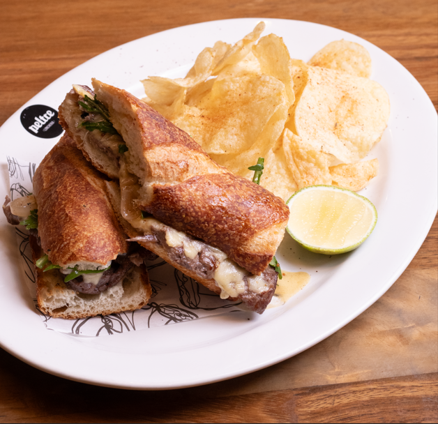 310 g. Sirloin Prime, mix de queso, mayonesa, cebolla caramelizada, arugula y aderezo de mostaza miel. Acompañado con jugo de carne y papas crujientes con polvo de chiles.
