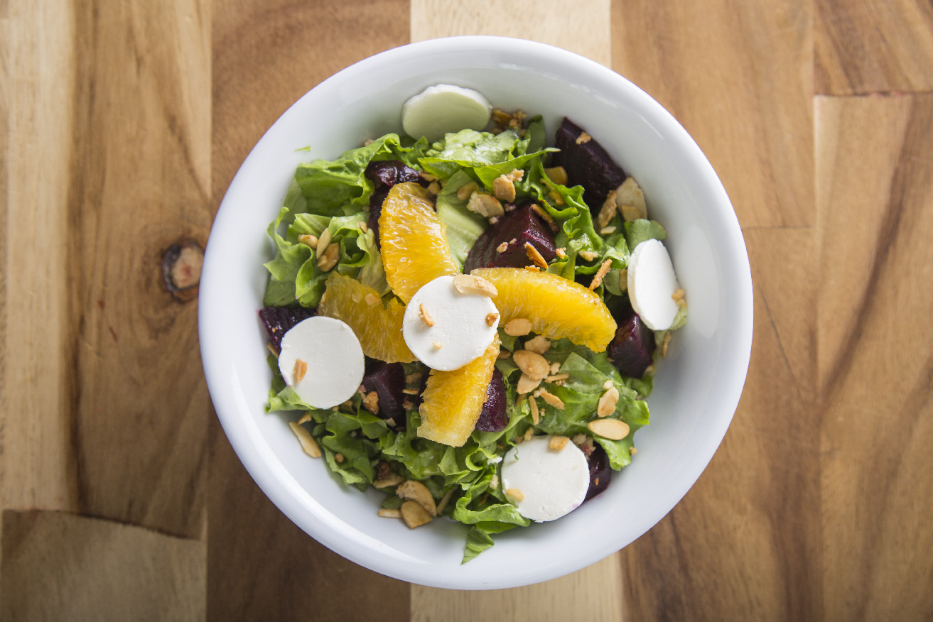 350 g. Mezcla de lechuga, cubos de betabel rostizados, almendra caramelizada, queso de cabra, supremas de naranja y vinagreta de naranja.