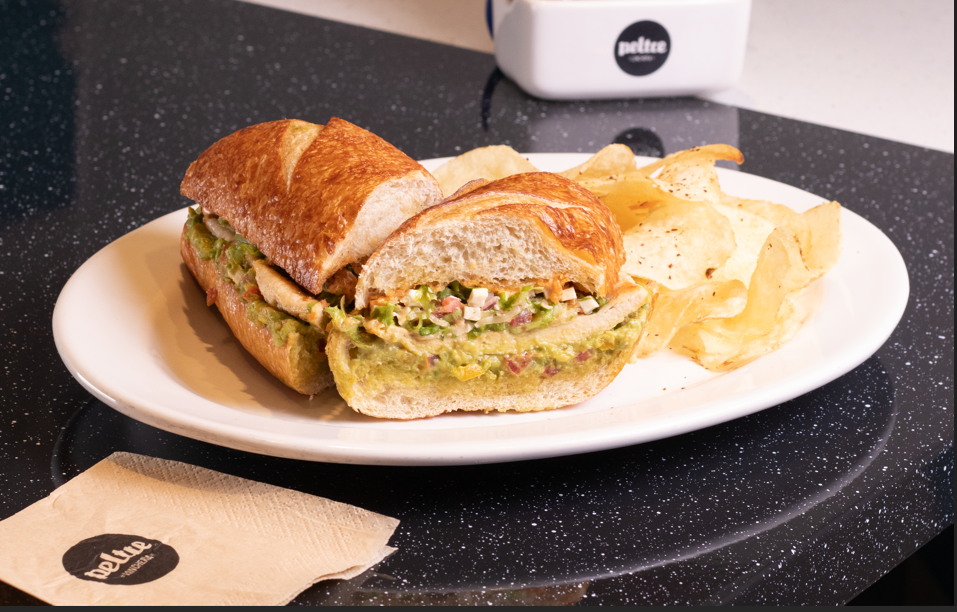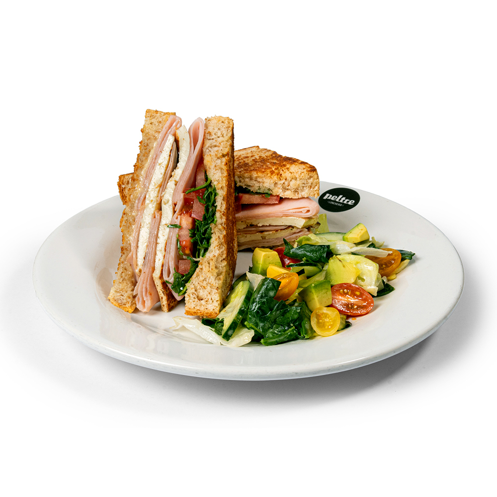 270 g. Sandwich con pechuga de pavo, queso panela, arúgula, jitomate, mayonesa y aderezo de mostaza y miel, acompañado con ensalada verde con vinagreta Peltre.