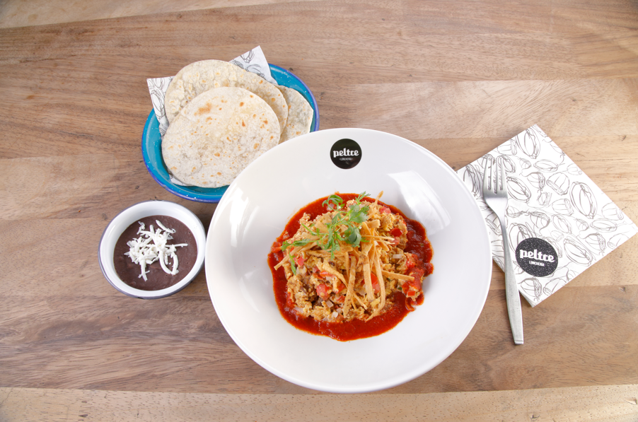260 g. Huevos revueltos con salsa mexicana y machaca, bañados de salsa de chile guajillo, acompañados de frijoles refritos con queso fresco y tortillas de harina.