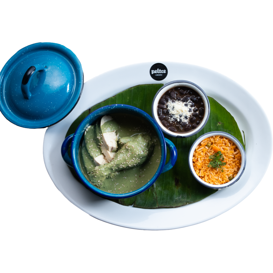450 g. Cazuela con pipián verde de pepita de calabaza, calabacitas tiernas, pechuga, piernita de pollo y ajonjolí tostado. Acompañada con arroz, frijoles de la olla y tortillas de maíz.