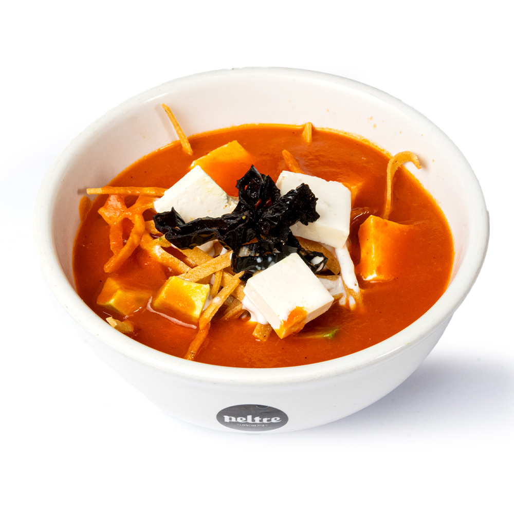 250 ml. Sopa con caldillo de jitomate, tortilla en juliana, crema, queso fresco, aguacate y chile pasilla.
