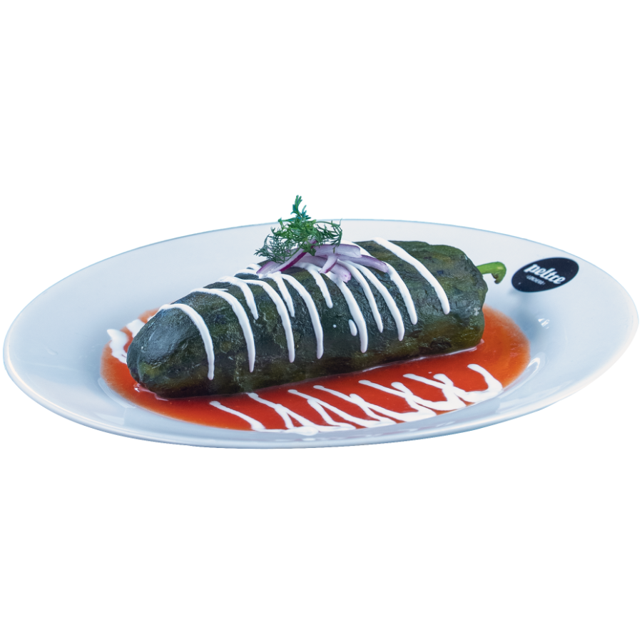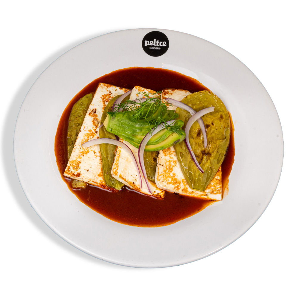 300 g. Vegetariano. Relleno suave y cremoso con queso chihuahua y frijoles refritos, bañado en caldillo de jitomate y coronado con cebolla morada y cilantro fresco.