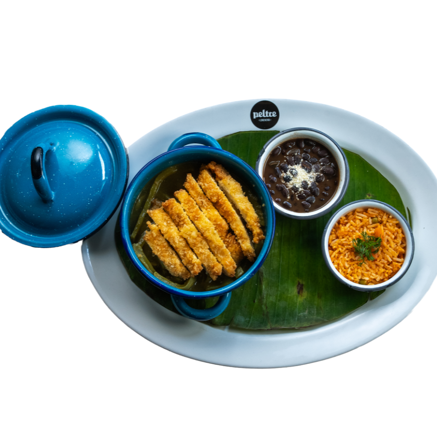 400 g. Crujiente milanesa de pollo servida sobre nopales en salsa verde. Acompañada con arroz, frijoles de la olla y tortillas de maíz.