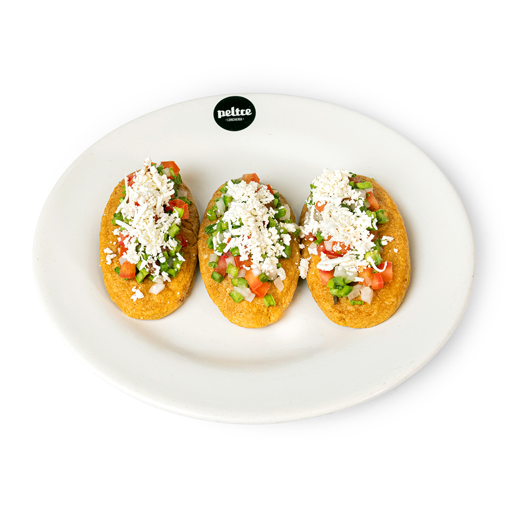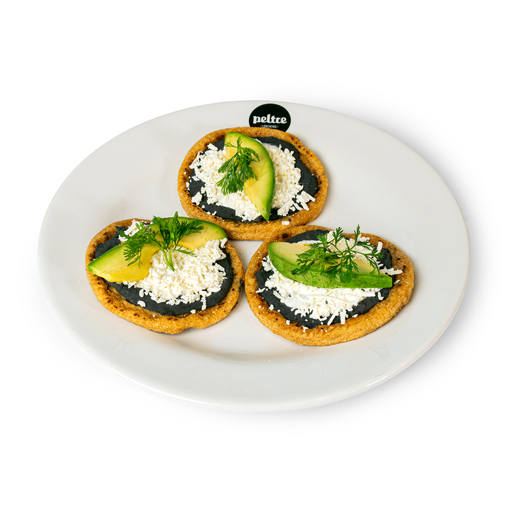 200 g. Tres sopes con frijoles refritos, crema, queso fresco, cilantro, aguacate y polvo de quelite. Agrega el complemento de tu elección: pollo, cecina, huevo, chorizo o pastor...