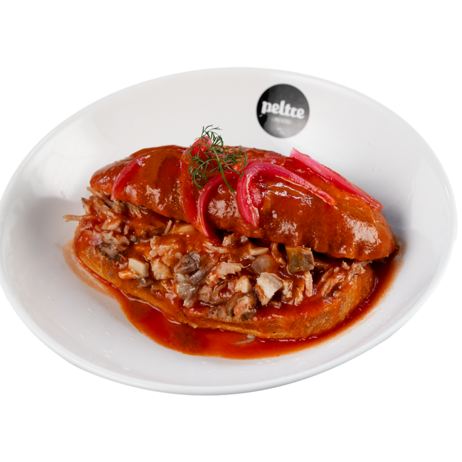 380 g. Pan birote dorado relleno de carnitas , bañado en caldillo de jitomate y salsa de chile árbol, acompañada de cebolla encurtida.