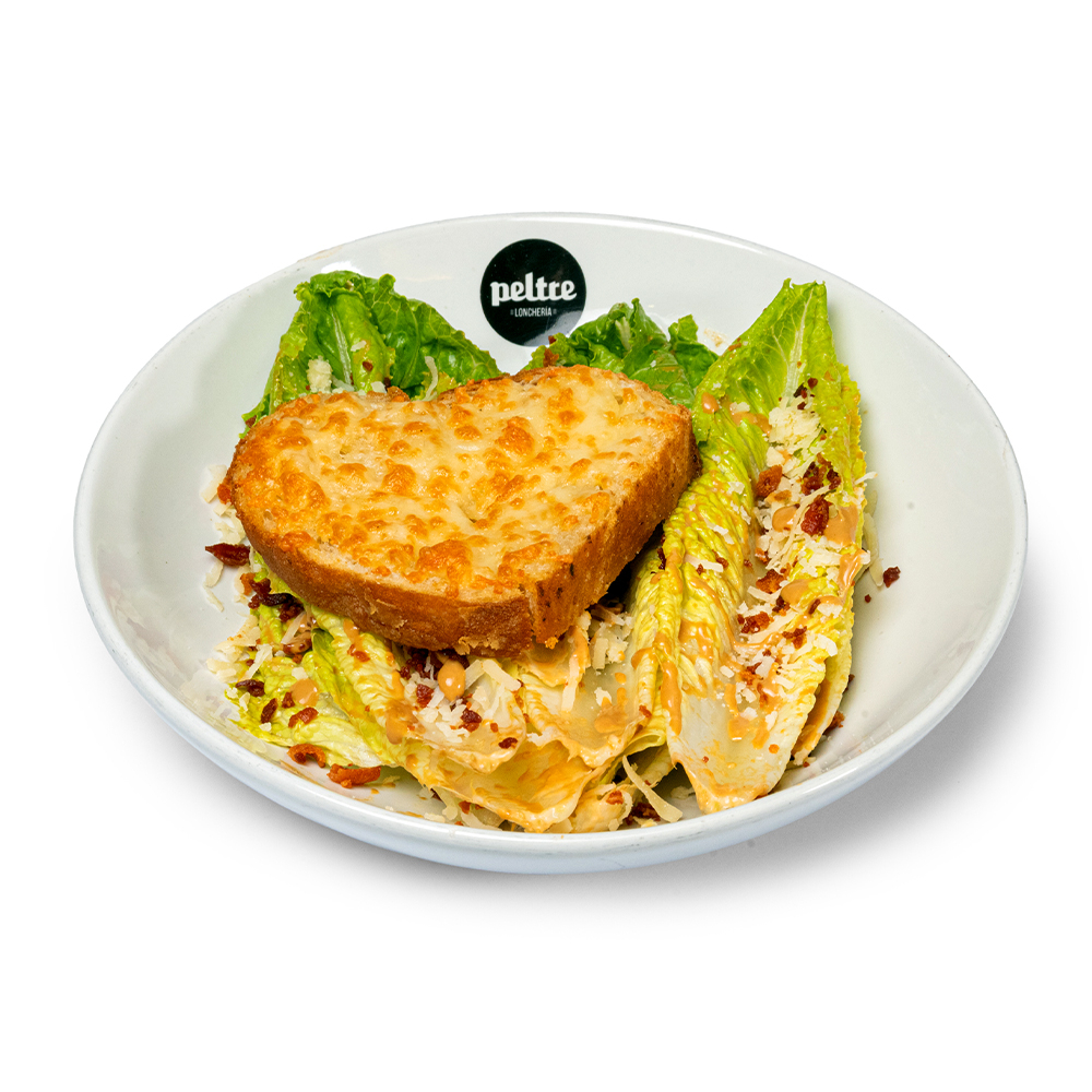 290 g. Corazones de lechuga con aderezo cesar, acompañado de queso parmesano y crouton de pan de masa madre hecho en casa, espolvoreado con tocino crujiente.
