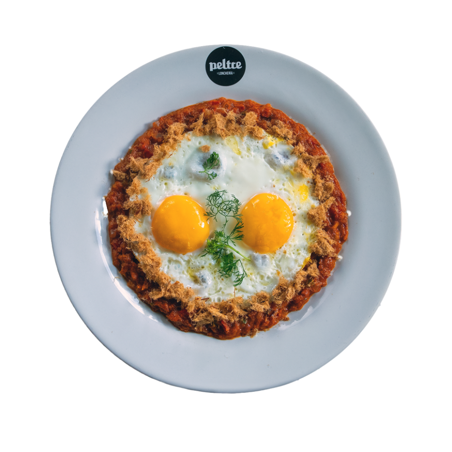 340 g. Huevos estrellados, montados sobre tortilla de maíz, bañados en salsa roja, con polvo de chicharrón y cilantro; acompañados de frijoles refritos con queso chiapas y una rebanada de pan de caja hecho en casa.