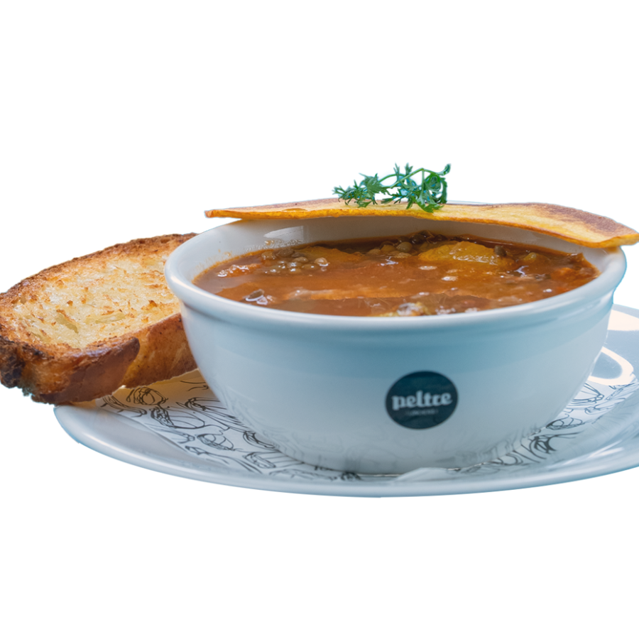 300 ml. Lentejas caldositas con tocino, chorizo y plátano macho frito. Acompañadas de pan de masa madre con mantequilla de ajo.