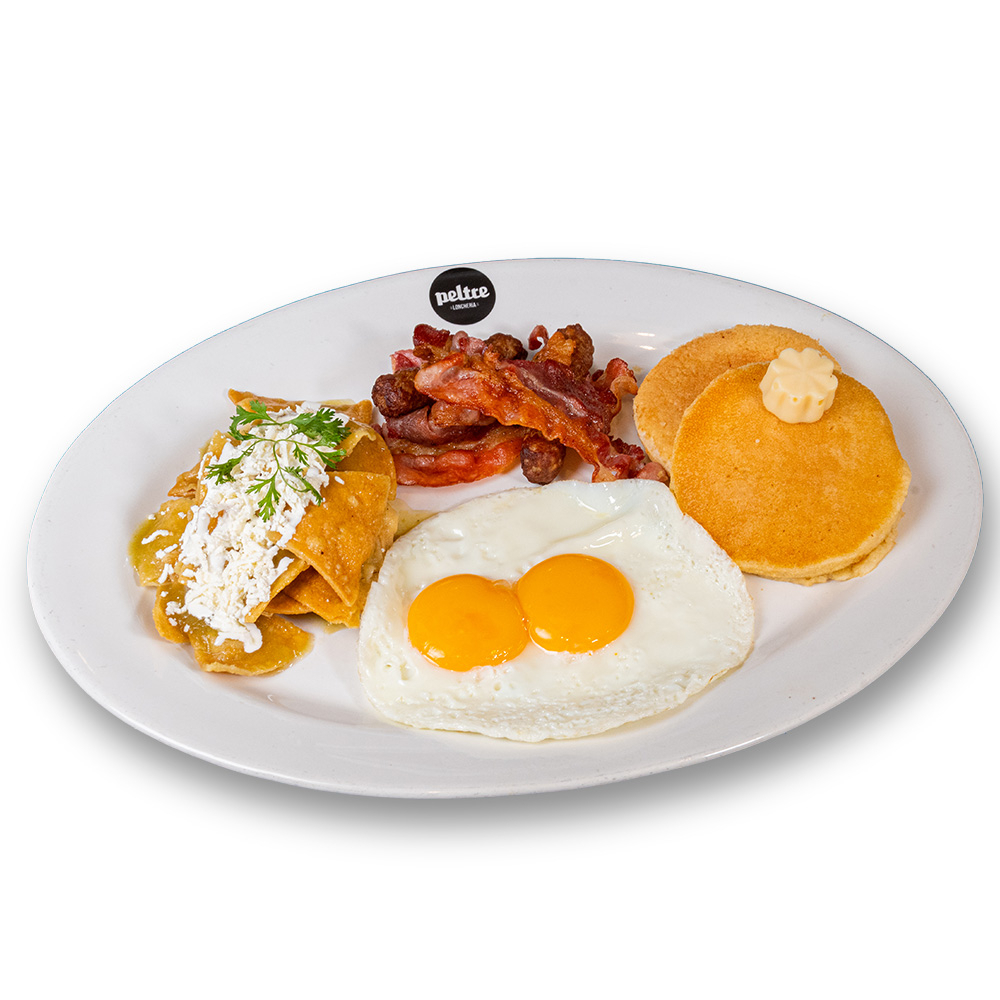 450 g. Dos huevos al gusto, salchicha de desayuno, tocino, chilaquiles verdes o rojos y dos piezas de hot cakes con mantequilla, con jarabe maple o mermelada de la casa o miel de abeja.