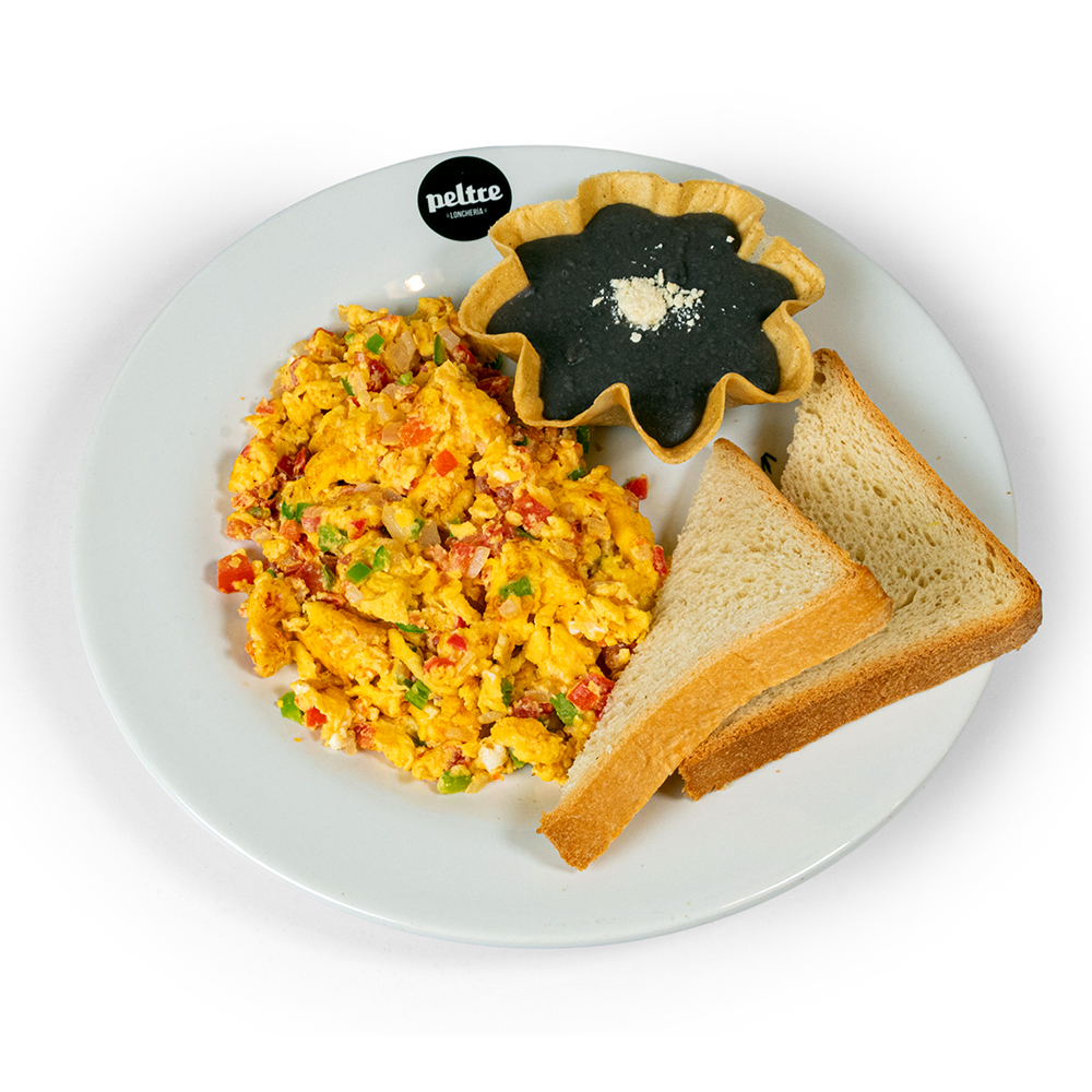 230 g. Huevos revueltos con jitomate, cebolla y chile serrano, acompañados de frijoles refritos con queso chiapas y una rebanada de pan de caja hecho en casa.
