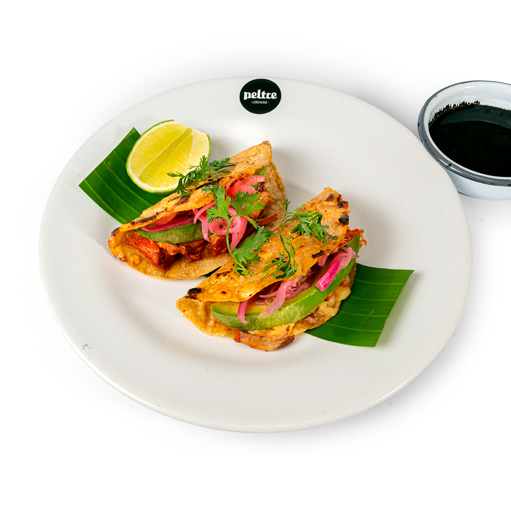 215 g. 2 piezas, quesadillas de cochinita pibil, doradas al comal, queso, salsa xnipec, salsa de chile habanero y aguacate.