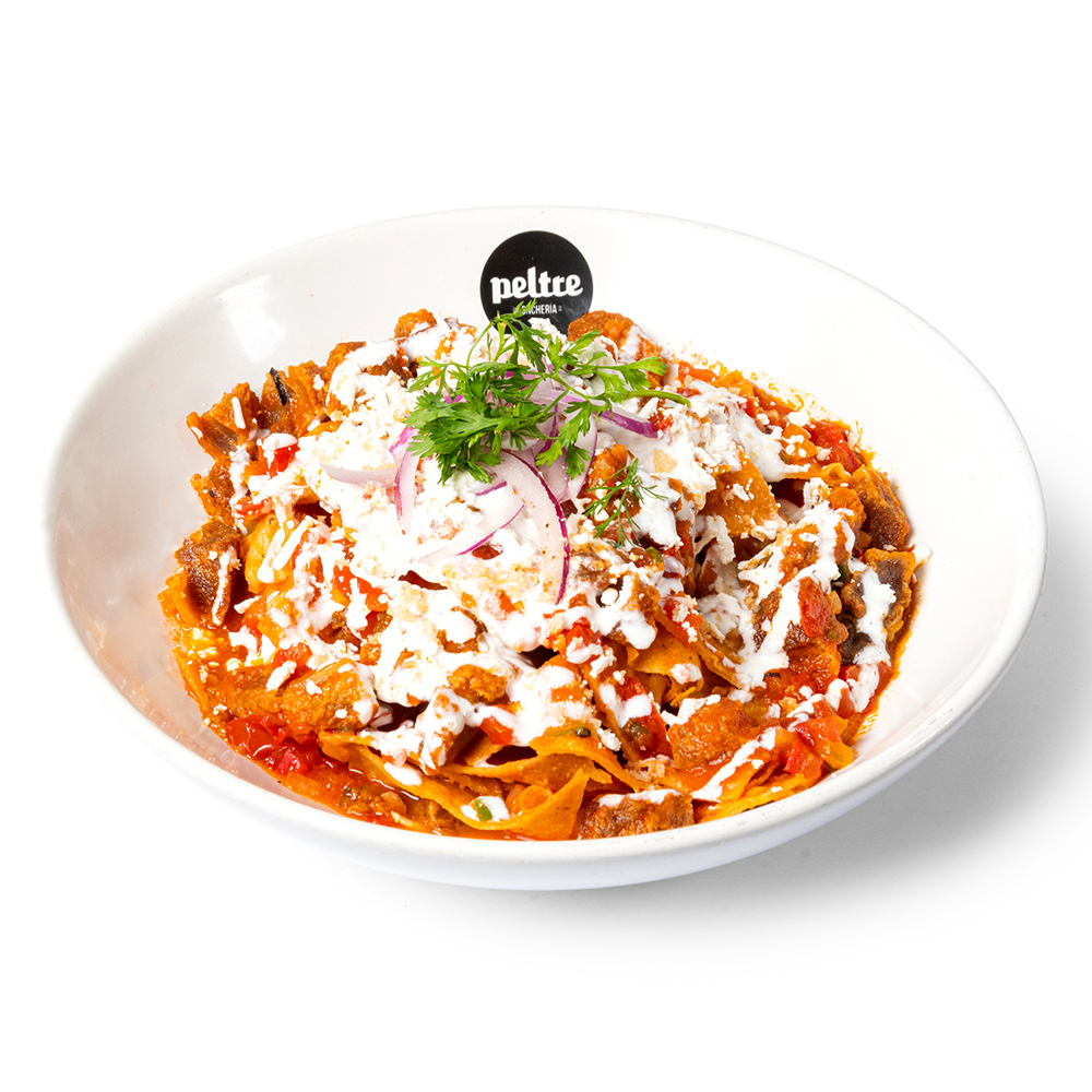 820 g. Salsa ranchera, chicharrón regio, crema ácida, queso fresco, cebolla morada y cilantrillo.