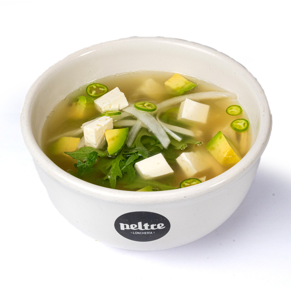 250 ml. Caldo de pollo con pasta de caracol, pollo deshebrado, queso panela, aguacate, arúgula, berros, cebolla y chile serrano.