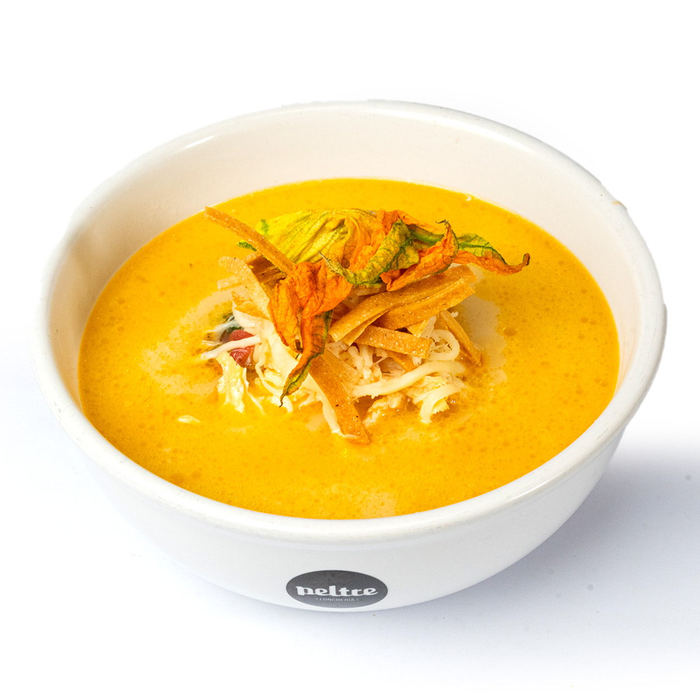 250 ml. Sopa con crema de elote, quesillo, granos de elote y pollo deshebrado, acompañado de tortilla en juliana y flor de calabaza deshidratada.