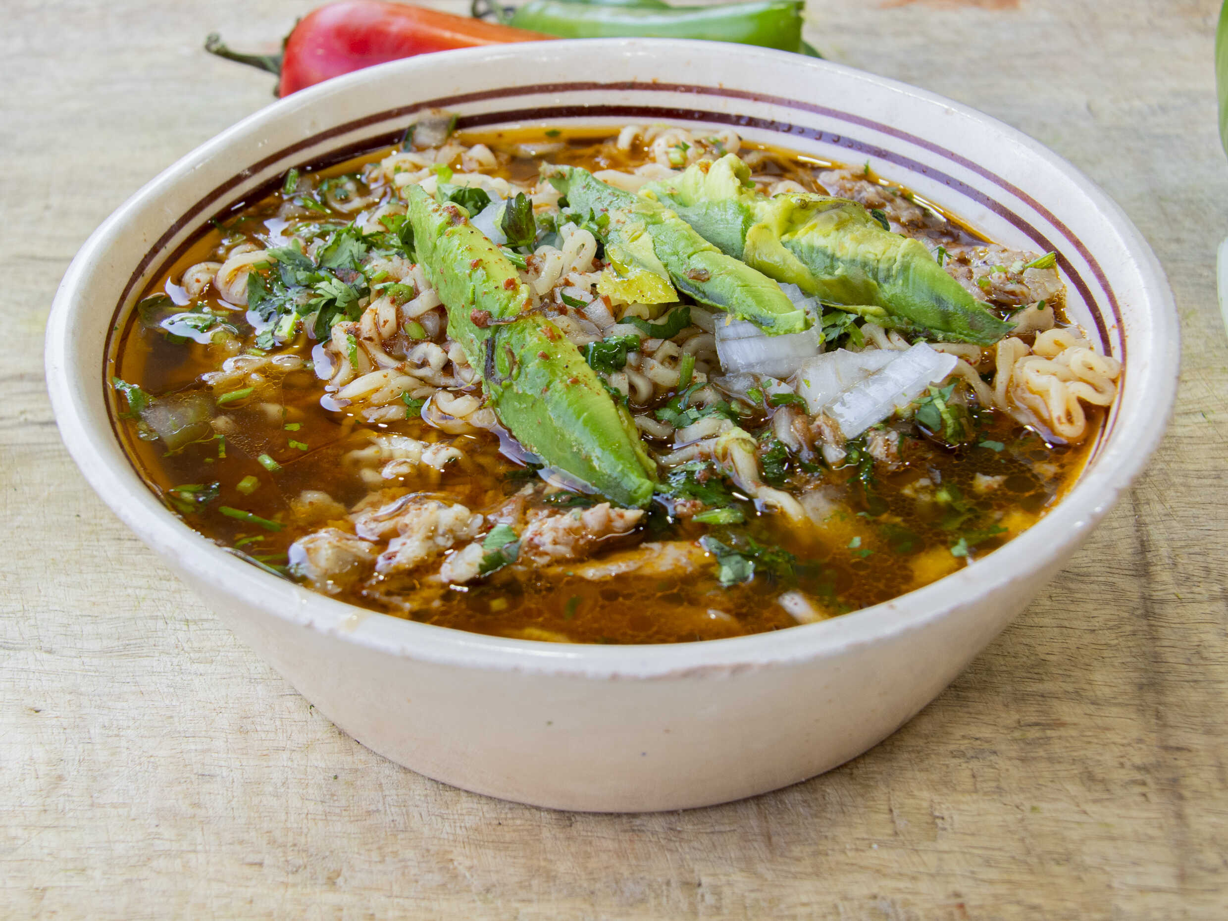 Porción personal de la gran combinación de fideos tipo ramen con carne de birria, consomé y limones, aproximadamente 170 g de fideos y 120 g de carne.
