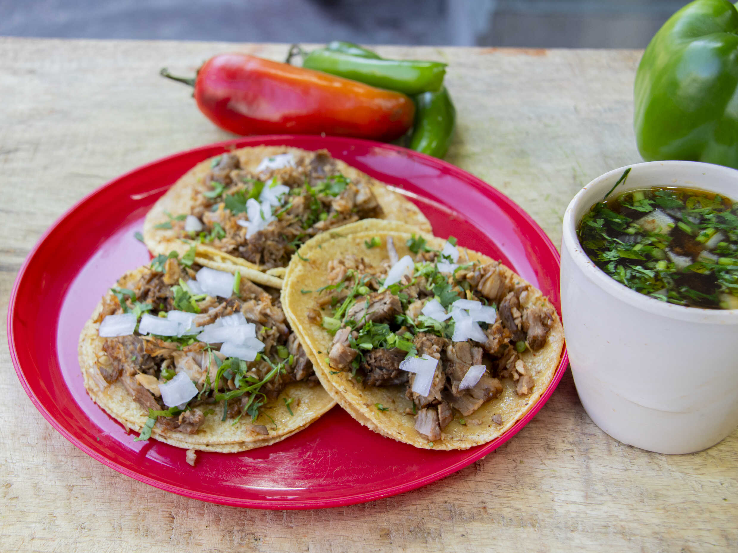 Te incluye salsa (verde o roja) y limones. no incluye consomé, puedes ordenar tacos con consomé seleccionando algún combo del menú.