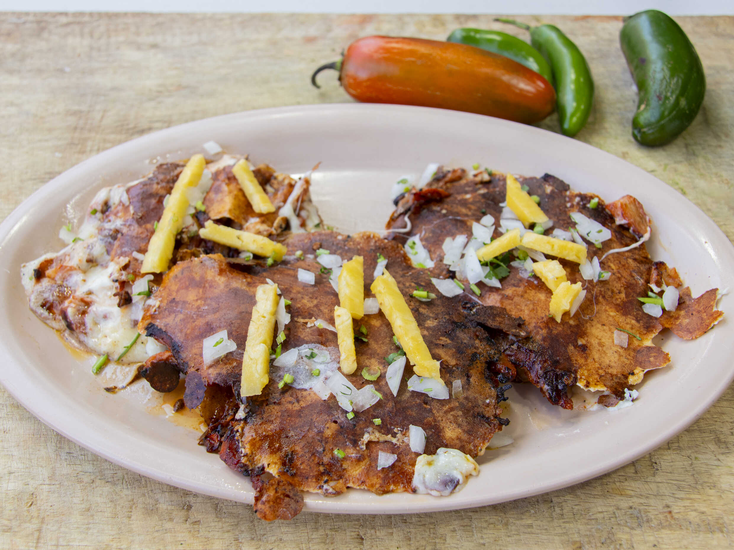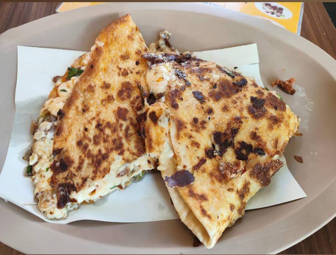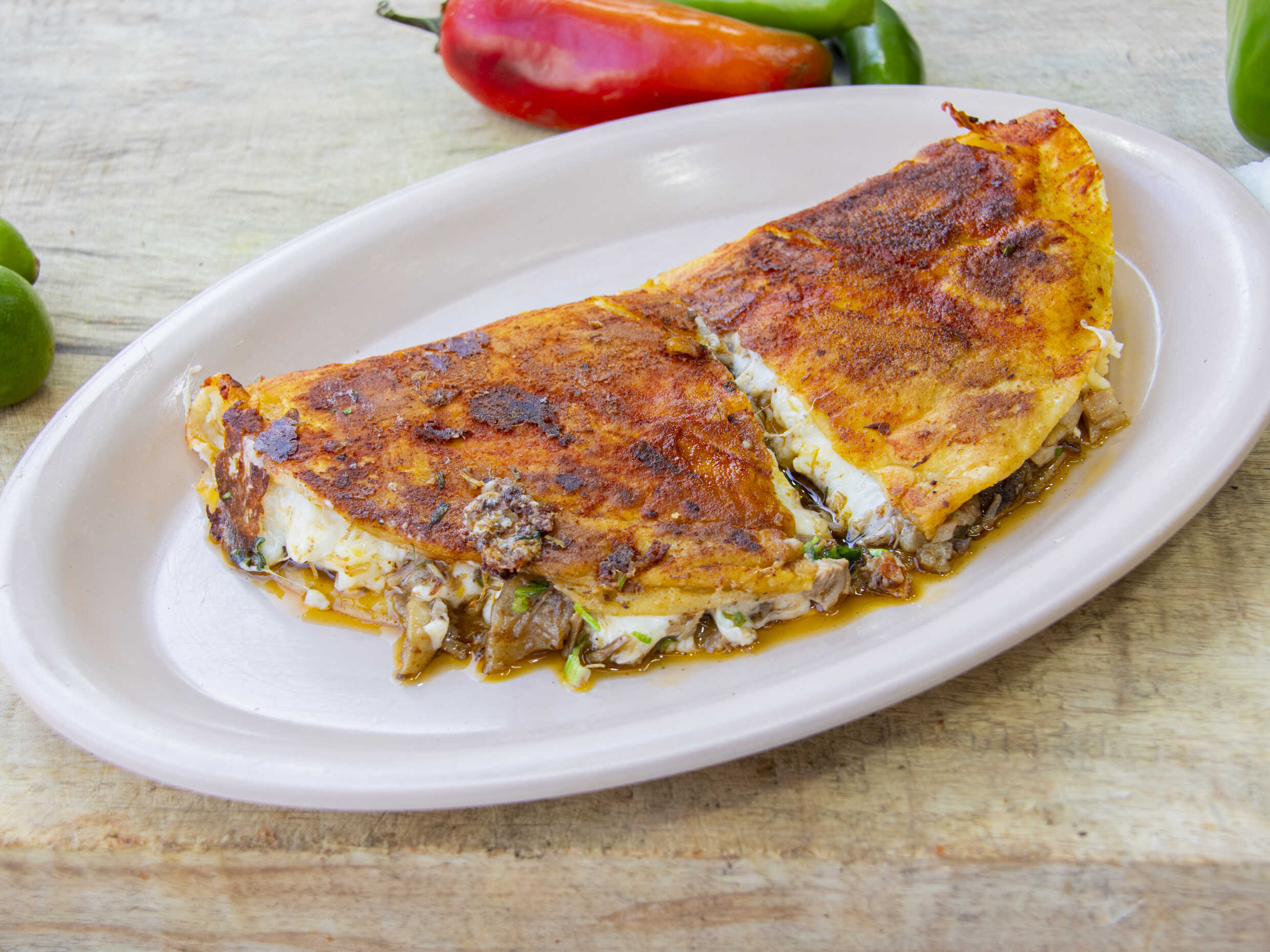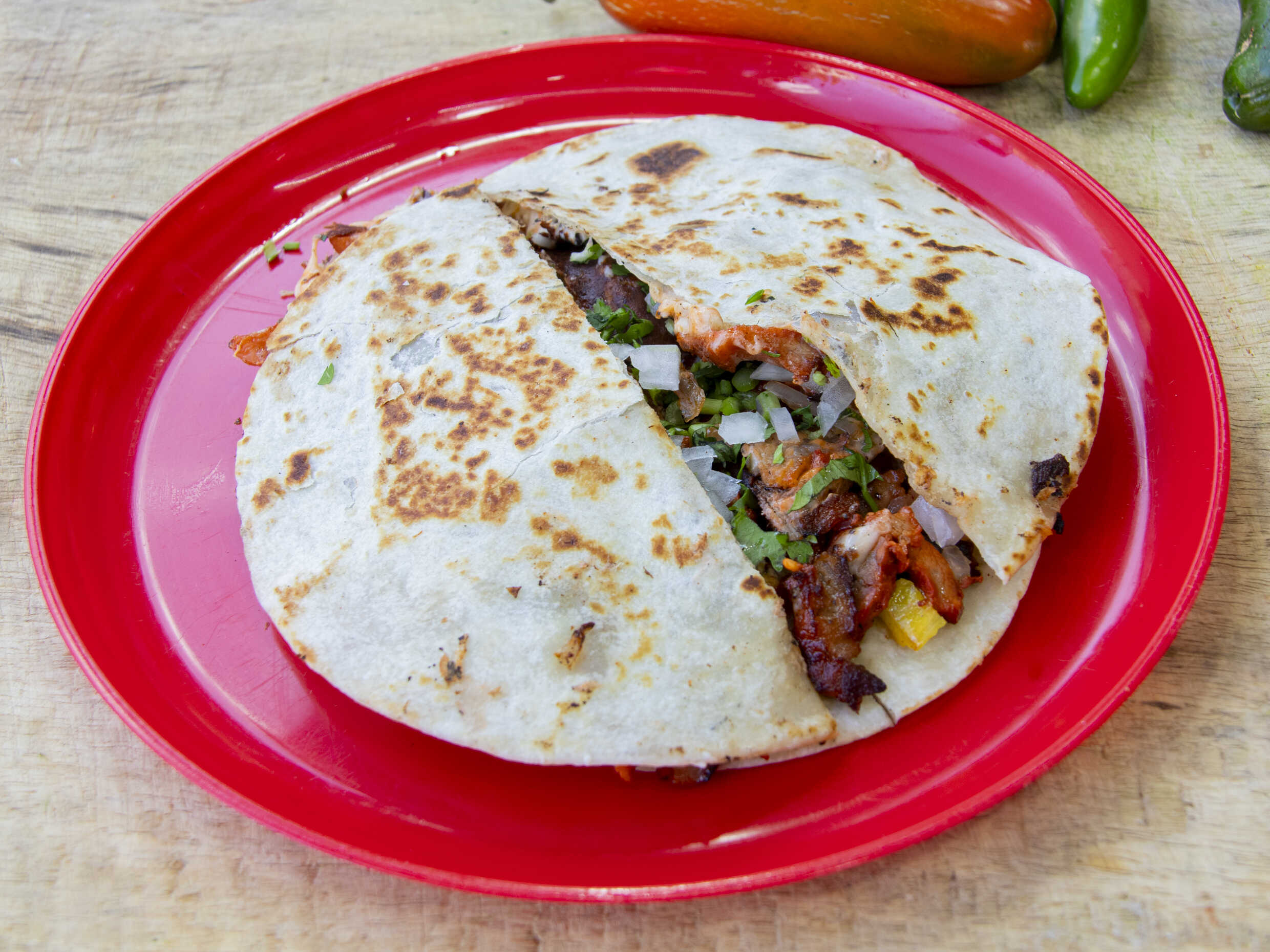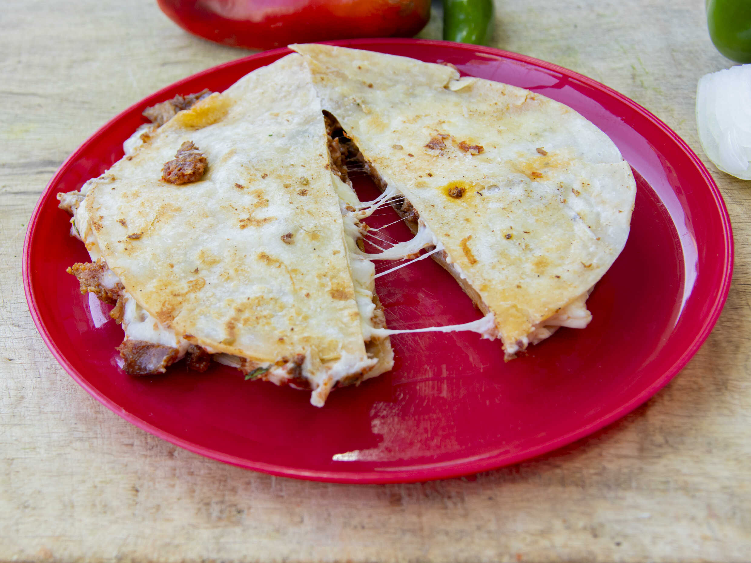 Rica carne preparada al pastor con queso fundido entre dos tortillas de harina.