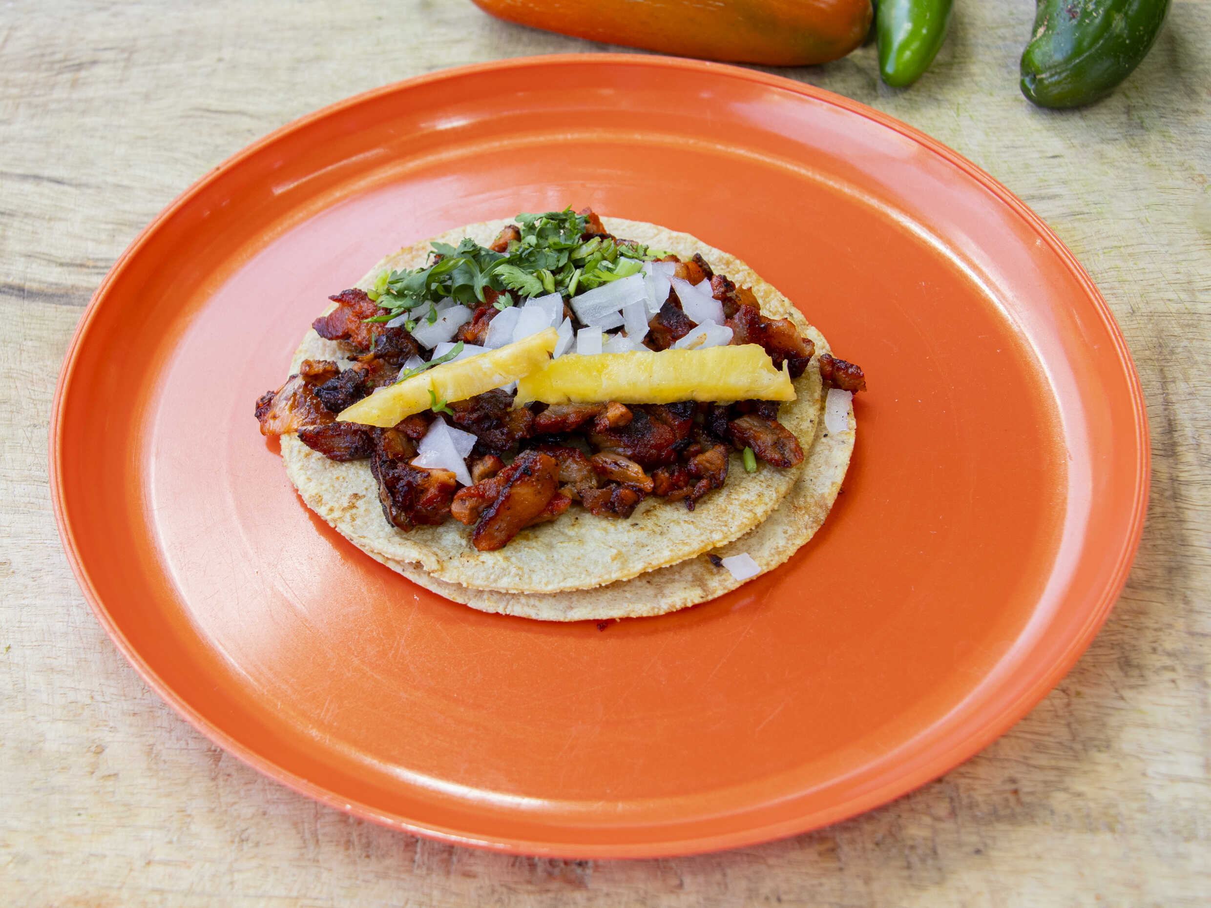 Carne preparada al pastor sobre una tortilla cubierta con queso fundido.