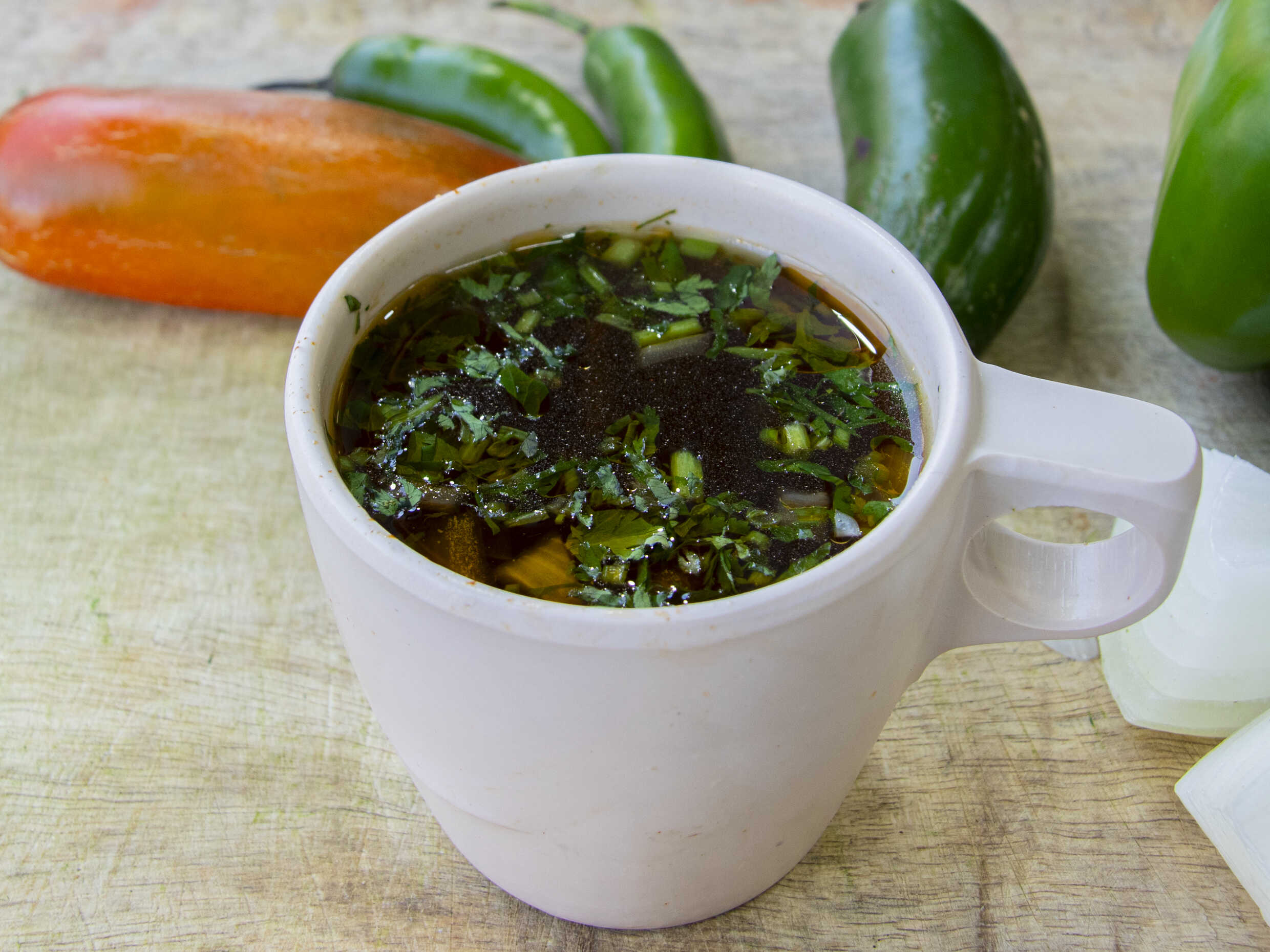 Delicioso consomé de birria en un vaso de unicel de 1 litro.
