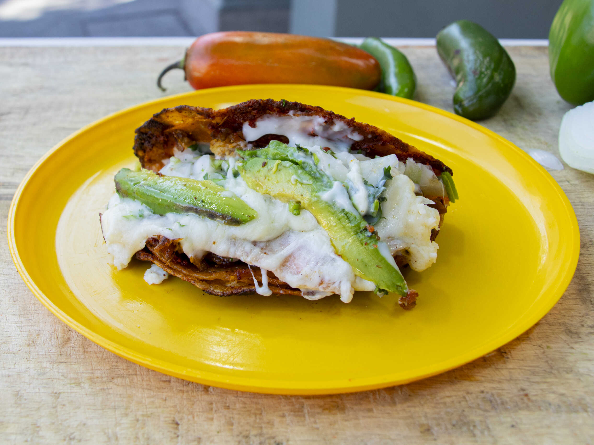 Al estilo de nuestros doraditos de birria. Dorado a la plancha con un adobo especial y preparado con cilantro, cebolla, crema, aguacate y el extra: queso fundido.