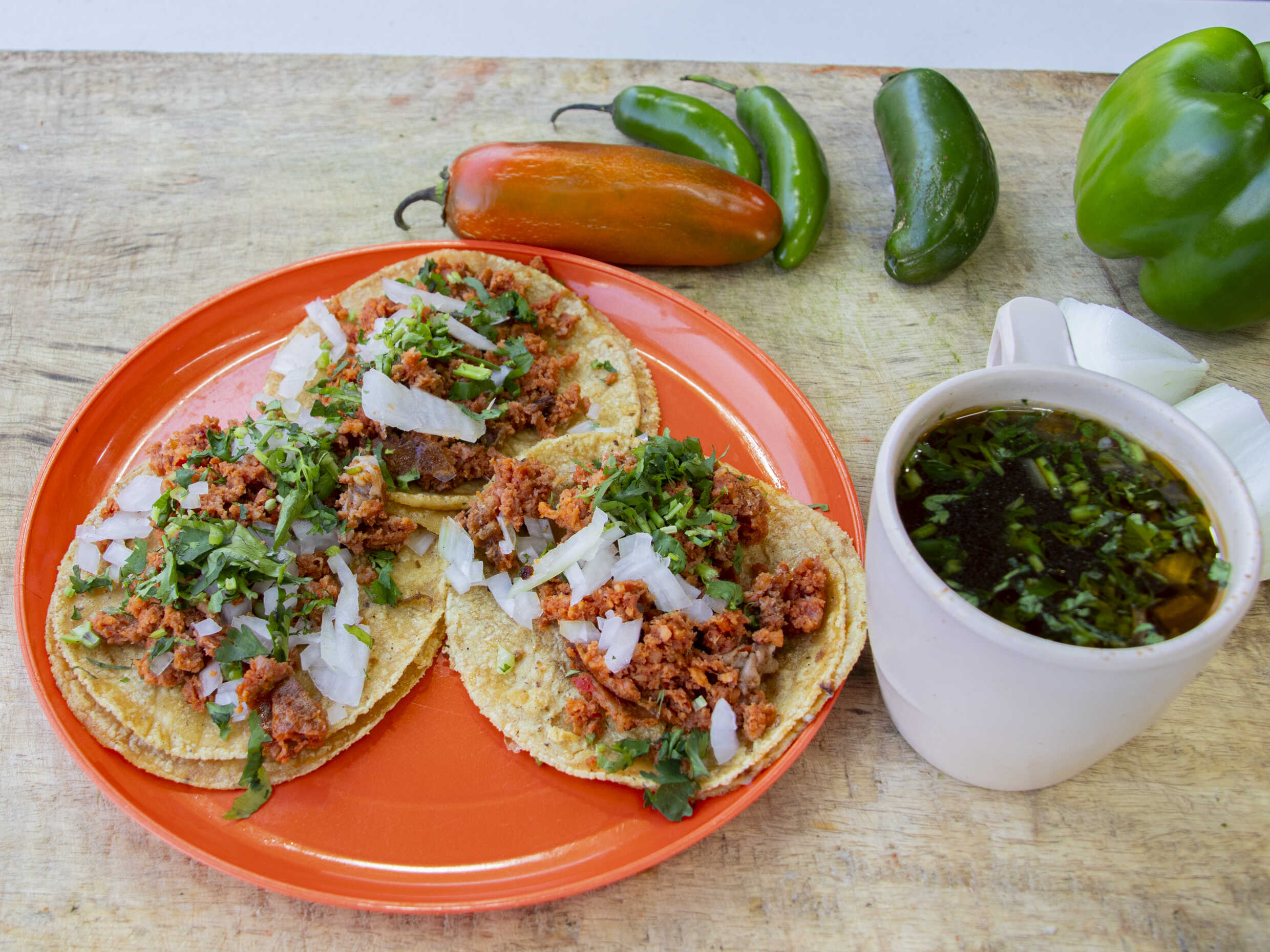5 taquitos de longaniza y un consomé de birria. (porciones aproximadas: 40 g de carne por taco, diámetro tortilla 10 cm)