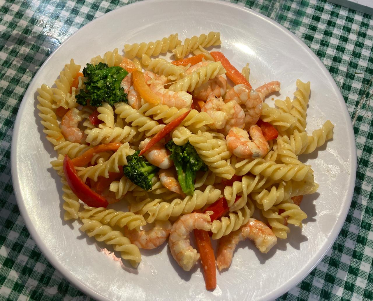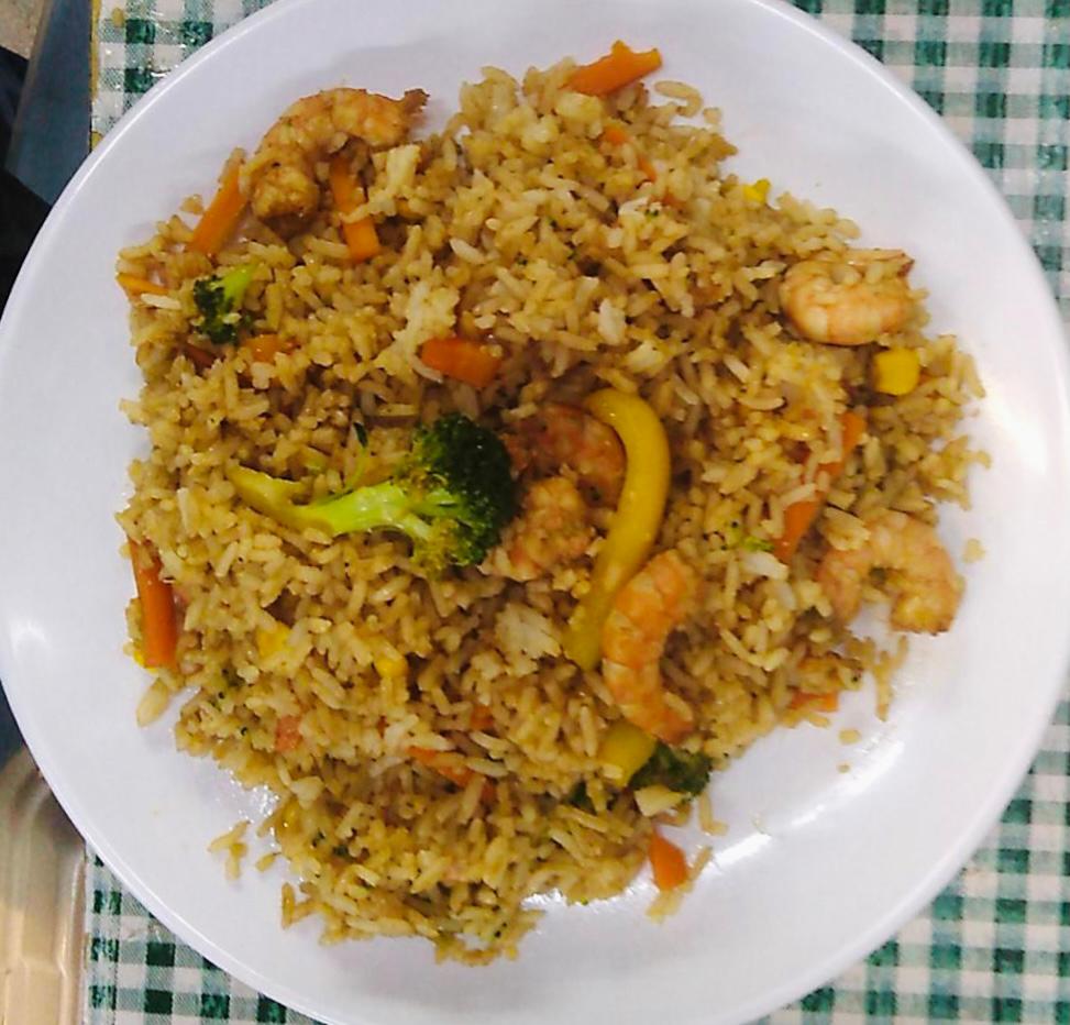 Arroz con camarones, brócoli y zanahoria estilo yakimeshi