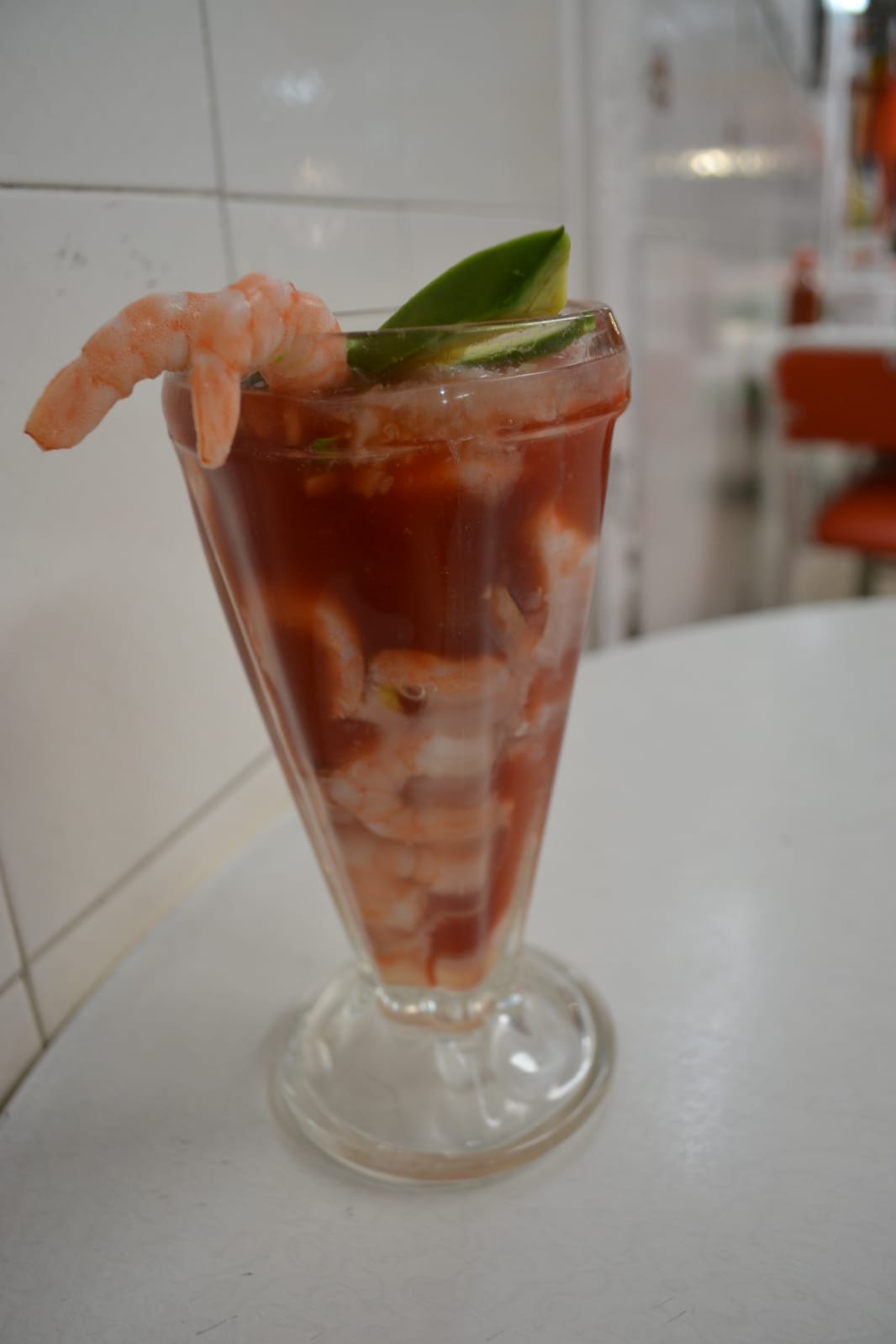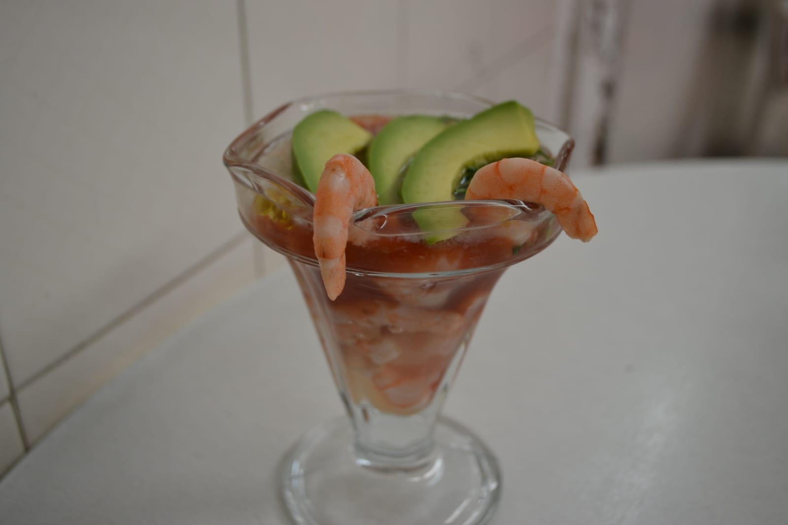 Camarón coctelero acompañado de aceite de oliva, catsup, cebolla, cilantro y aguacate