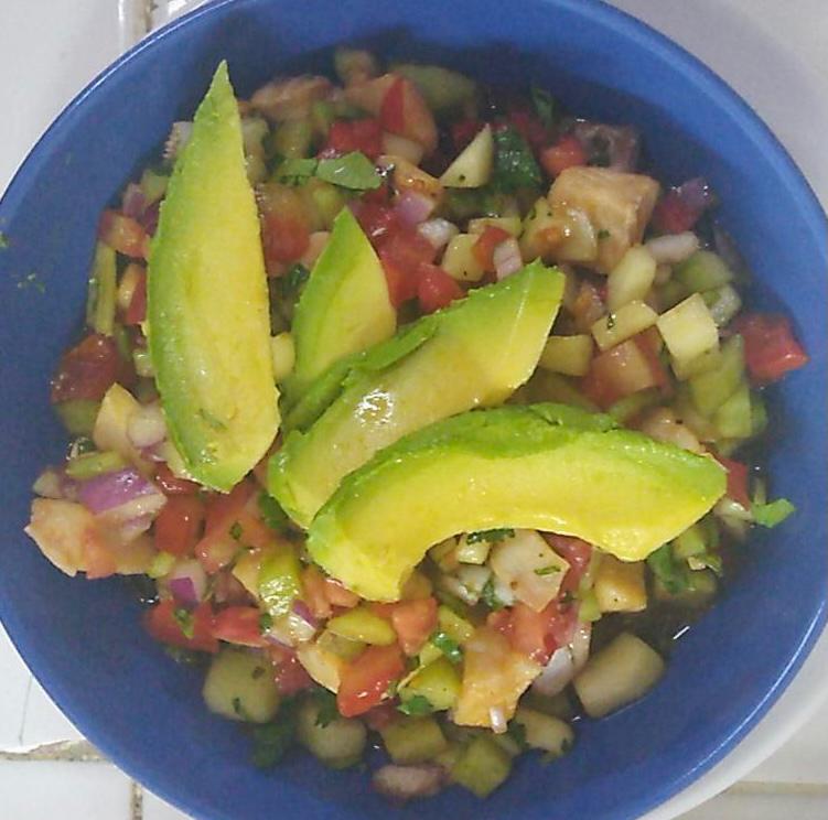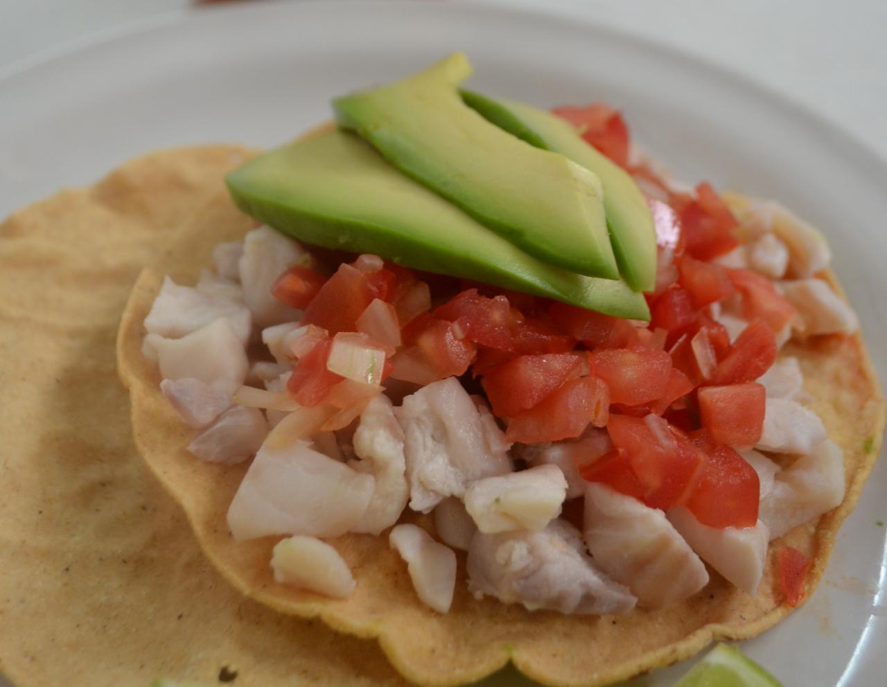 Pescado en trozos cocido con vinagreta acompañado con aguacate, jitomate, cebolla morada, pepino, cilantro y nuestra salsa especial.