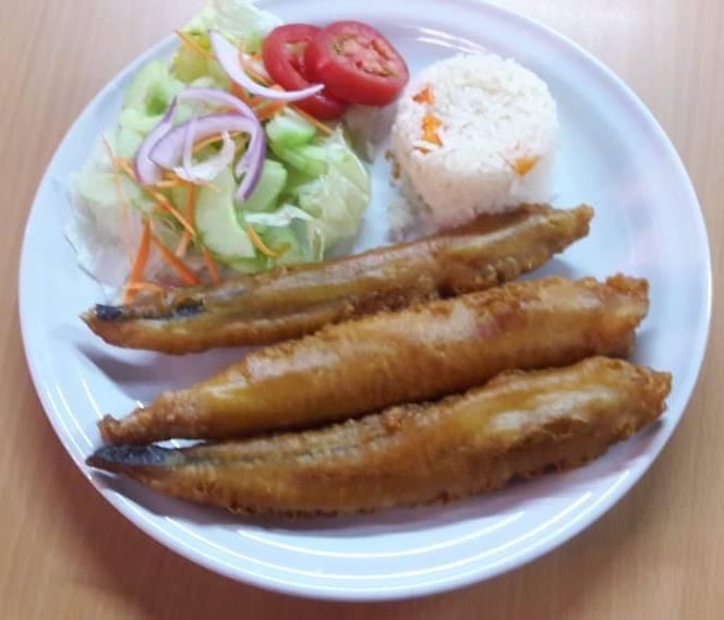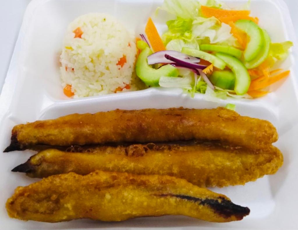 (3pzs) Pescaditos capeados con harina acompañados de arroz y ensalada.