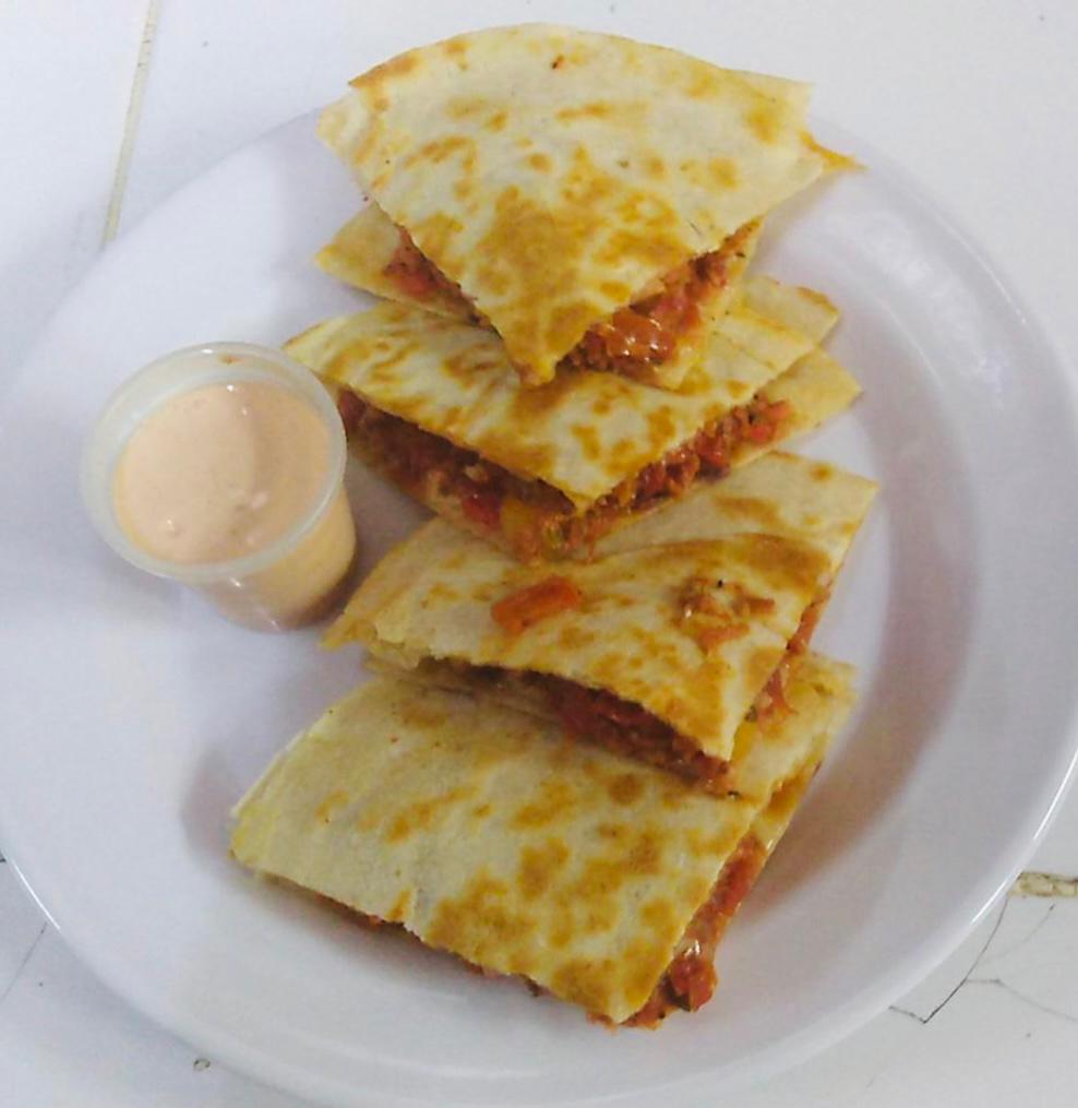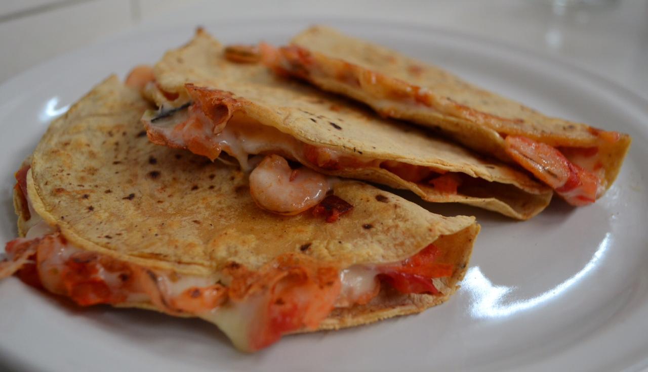 Guiso de camaron con tocino y piña gratinado con queso manchego entre 2 tortillas de harina.