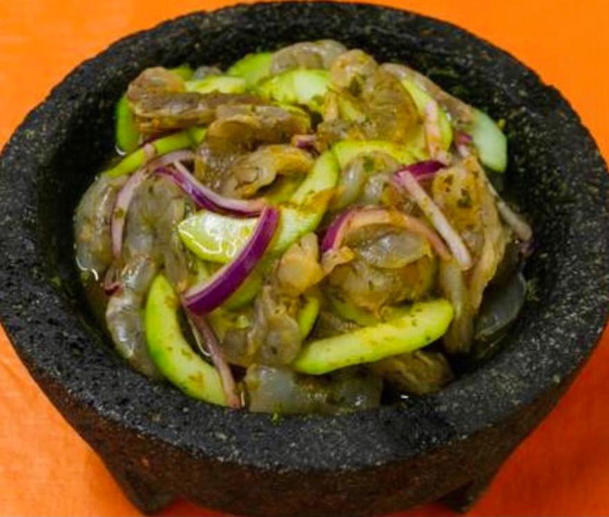 Camarón crudo y desvenado con pepino, cebolla morada y nuestra salsa especial preparada en molcajete. (Porción personal)