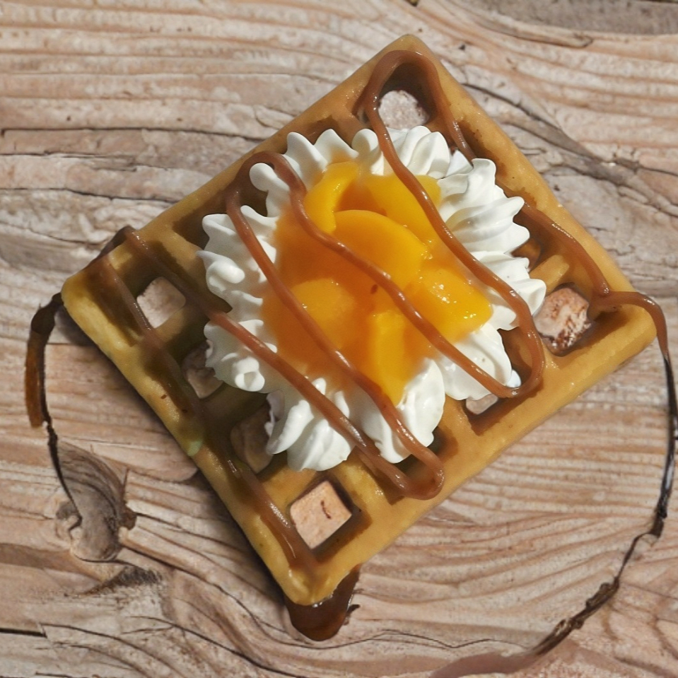 2 piezas waffles, cubierta a eleccion. Acompañados de crema batida y duraznos.