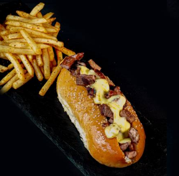 125 de Arrachera asada al grill, gratinada con queso gouda servido en pan artesanal. Incluye 125g de papas a la francesa