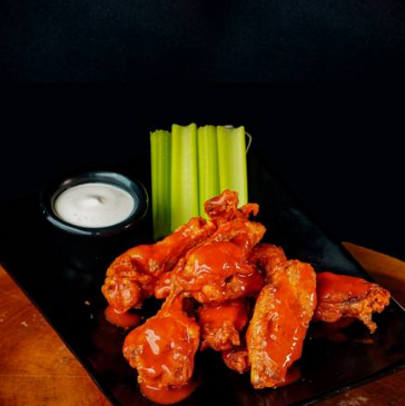 300gr de alitas de pollo (entre 7 y 10 pz), bañadas en salsa a elegir, acompañadas de 4 bastones de apio y 29 ml. de blue cheese.