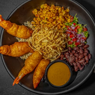 120g arroz blanco, 90g frijol, 4 piezas de camarón tempura, tortilla frita, lechuga, pico de gallo, granos de elote y aderezo.
