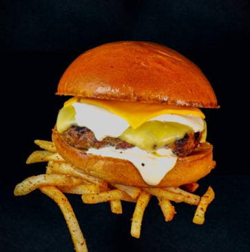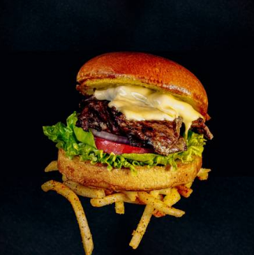 200 g de carne de res con queso estilo americano, queso philadelphia y queso gouda, con mayonesa. Acompañada de 125g de papas a la francesa