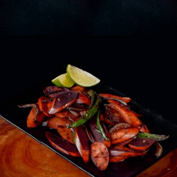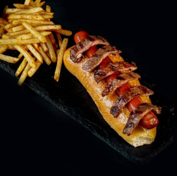 25 cm de Salchicha de Pavo, acompañada con 125g de arrachera en fajitas. Servido con 125g de papas a la francesa.