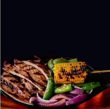 fajitas de arrachera (250g), con cebolla morada, Pimiento morron, chiles toreados, elote, salsa roja, limón fresco y tortillas de maíz o harina.