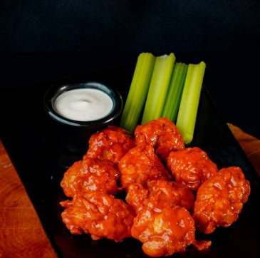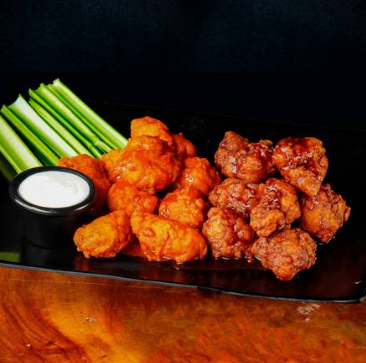 600gr de Boneless de pollo (entre 17 y 20pz), bañados en 2 salsas a elegir, acompañadas de 4 bastones de apio y 58 ml. de blue cheese.