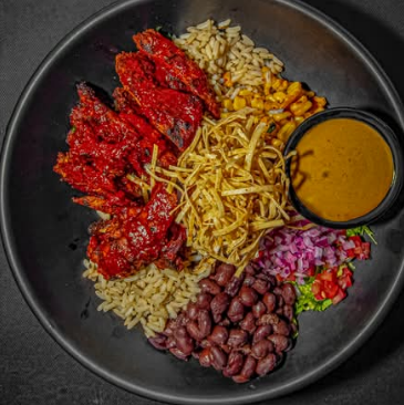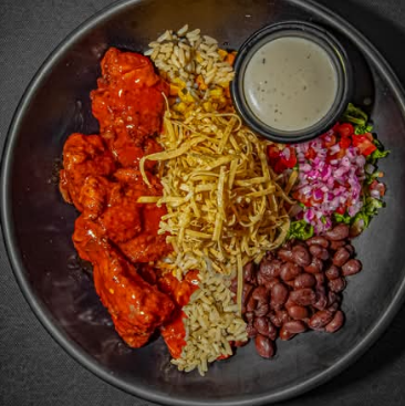 120g arroz blanco, 90g frijol, 150g boneless redhot, tortilla frita, lechuga, pico de gallo, granos de elote y aderezo.