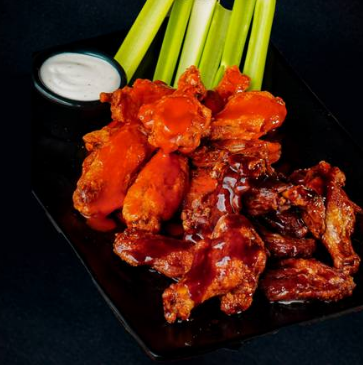 600gr de alitas de pollo (entre 17 y 20pz), bañadas en 2 salsas a elegir, acompañadas de 4 bastones de apio y 58 ml. de blue cheese.