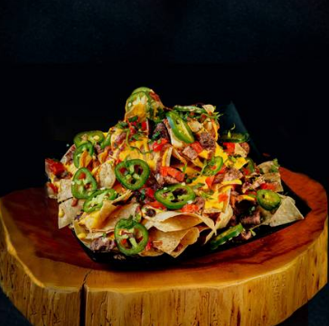 180g de totopos servidos con 180g frijoles, 180 ml queso amarillo, rodajas de chile cuaresmeño, jitomate, cilantro picado y 250g de Arrachera.