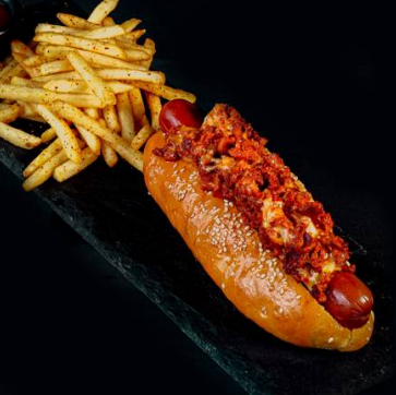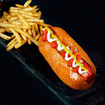 25 cm de Salchicha con choriqueso de Pavo, servido en pan artesanal. Acompañado con 125g de papas a la francesa.